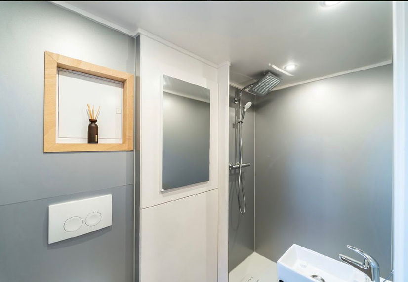Das Haus bietet eine 1,20m große Dusche sowie eine vollbiologische Toilette. Neben einem Hochbett für 2 Personen steht ein weiteres Ausziehbett im Wohnzimmer bereit. Ein Veranda für gemütliche Stunden gehört neben der Kaffeemaschine zur Ausstattung dazu.